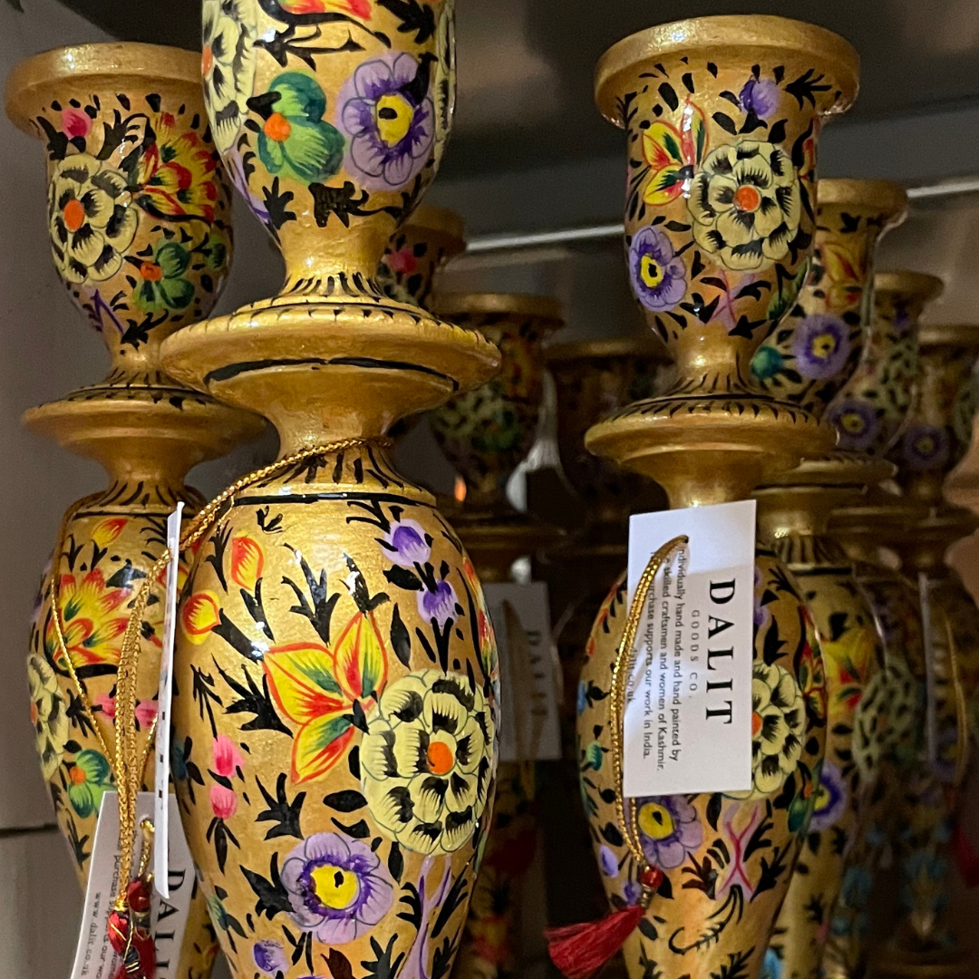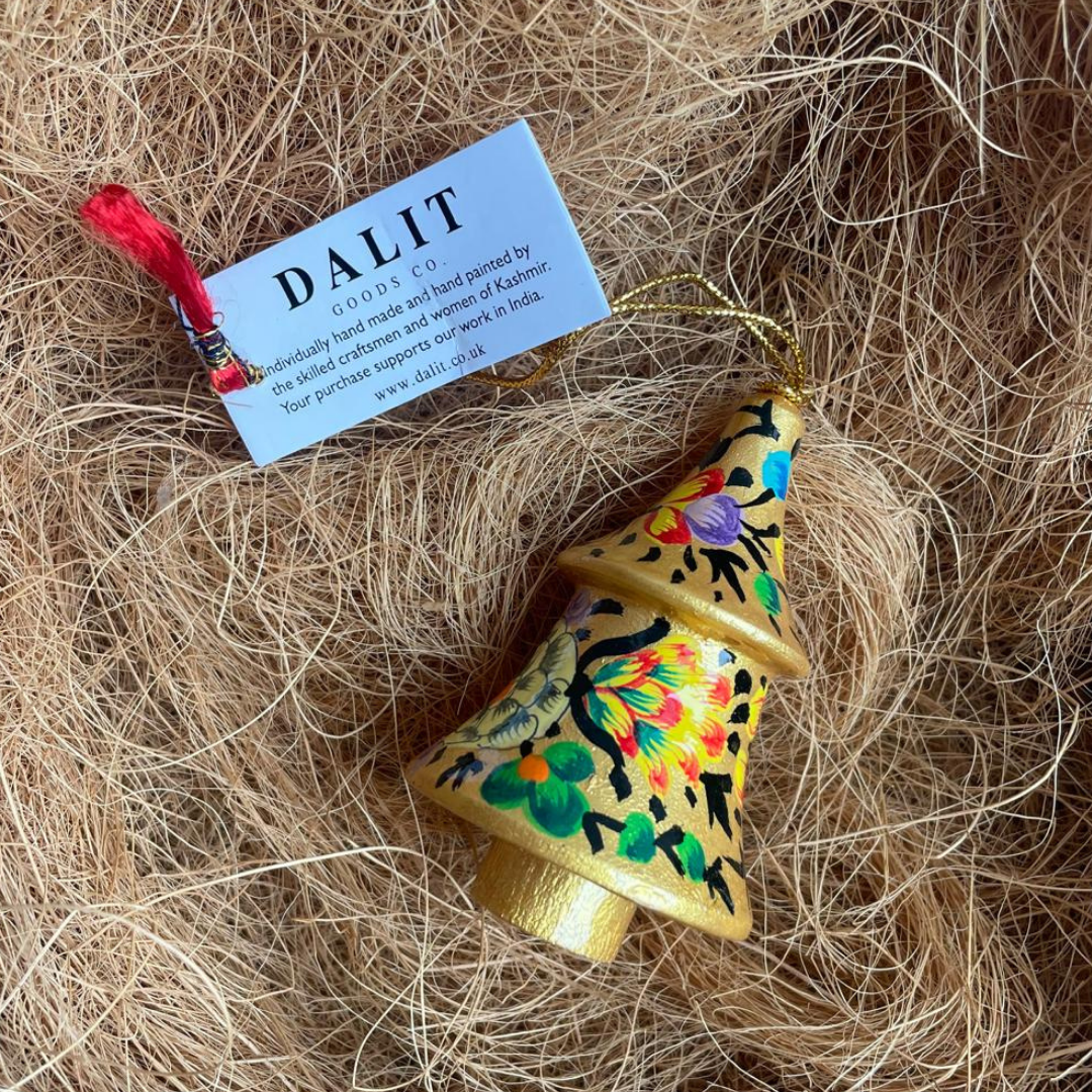 Individually hand made by the skilled craftsmen and women of Kashmir using papier-mâché. They are then hand painted with traditional Kashmiri designs. Single Decoration, approx 3".