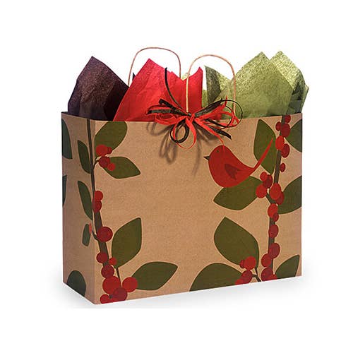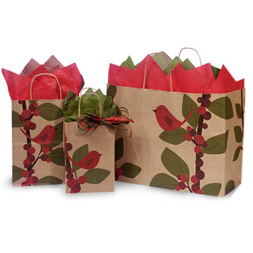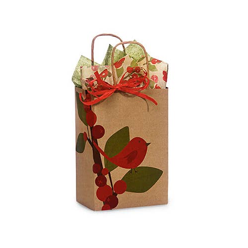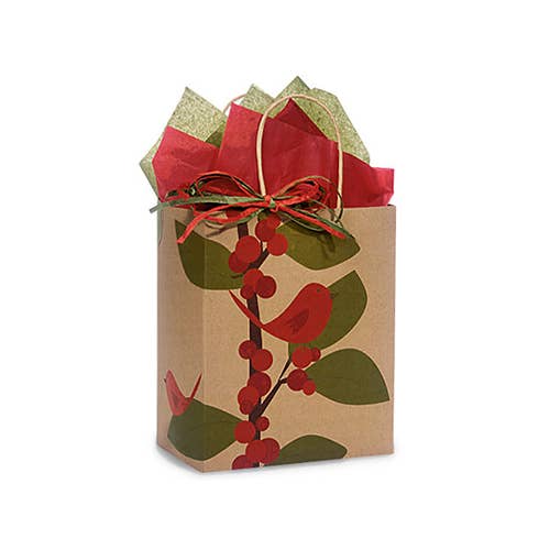 Red Bird Berries Paper Christmas Gift Bags: Cub 8x4.75x10.25" / 25 Pack